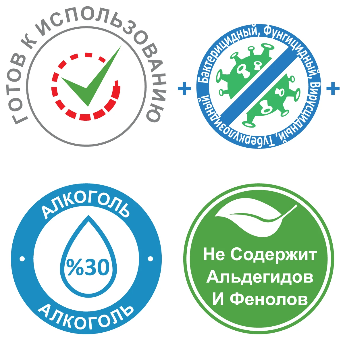 Широкая совместимость с материалами (кроме чувствительных к спирту поверхностей и акрилового стекла). Подходит для дезинфекции всех поверхностей и медицинских изделий.