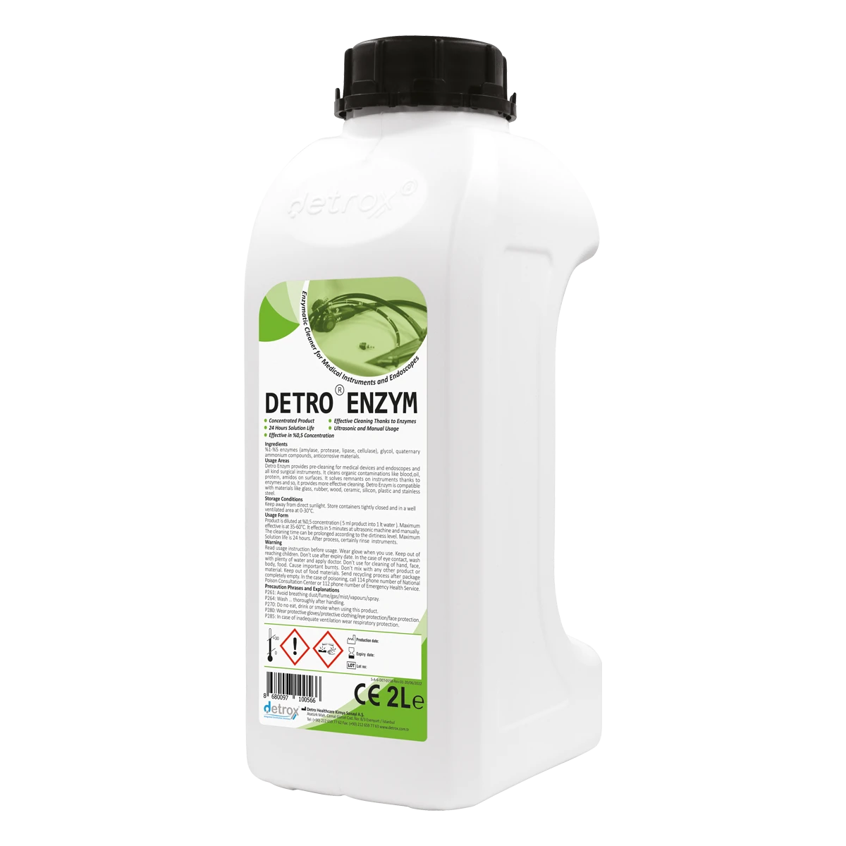Detro Enzym — это высокоэффективный концентрированный чистящий раствор для медицинских инструментов и оборудования. Разработан для эффективной очистки хирургических инструментов, медицинских приборов и эндоскопов. Особая формула, не содержащая альдегидов и фенолов, делает его универсальным продуктом, который можно использовать в различных областях.